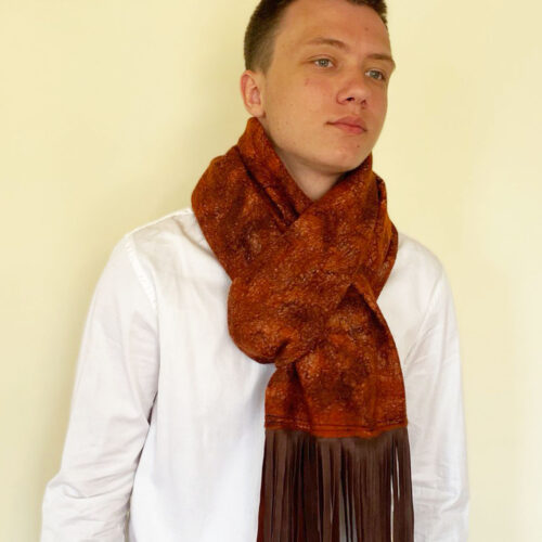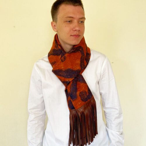Handmade scarf, double-sided. Extra fine merino wool - 65%, Cotton - 10%, Viscose - 5%, Tencel - 5%, Leather - 10%. Size: 223 - 48 cm